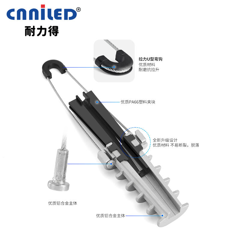 Ky kombinim ofron fortësi mekanike të shkëlqyeshme dhe rezistencë ndaj stresit mjedisor si era, reshjet dhe lëkundjet e temperaturës. Këto klamperje përdoren gjerësisht në sisteme të kabllove të lidhura ajrore me tension të ulët (ABC), duke ofruar montim të shpejtë pa nevojën e veglave speciale. Duke i siguruar kabllovë me forcë, klamperjet e fundit parandalojnë rrëshqitjen, zgjatin jetëgjatësinë e tyre dhe përmirësojnë besnikërinë e përgjithshme të rrjetit.